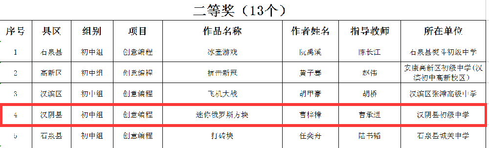 安康市第十一届学生信息素养提升实践活动获奖名单日前正式公布,汉阴县初级中学在本届活动中喜获一等奖1名、二等奖4名、三等奖5名。