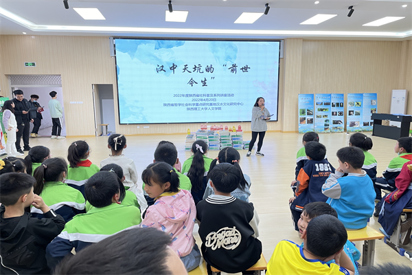 人文学院地理科学专业的吴洁博士为该校少先队员做了一场题为“汉中天坑的‘前世今生’”的科普讲座,让同学们感受到了大自然的鬼斧神工;讲解了有关生命起源和进化方面的知识,展示了不同生命演化阶段的典型古生物化石;播放了汉中非物质文化遗产短视频,让同学们更好地了解汉中历史文化,认识汉中的地域文化和本土文化,意识到保护和传承地域文化的重要性和必要性。