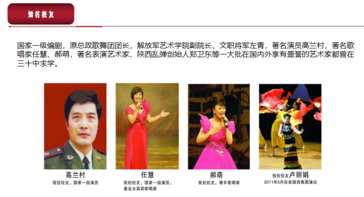 西安第三十中学艺术教育特色鲜明,异彩纷呈,培养了一大批国内外知名艺术家,如赵季平、张艺谋、左青、顾长卫、高兰村、姜怡翔、任慧、郝萌、郑卫东、姬他等。学校的舞蹈队、合唱团、戏剧社、管乐团、书法社多次获国家、省、市级比赛金、银奖,向知名高校输送艺术人才。与中国传媒大学合作,开设媒介素养班,培养传媒专业人才,成绩备受肯定。学校毕业生多次进入中央戏剧学院、浙江艺术学院等名校,取得优异成绩,受到家长和社会的一致好评。