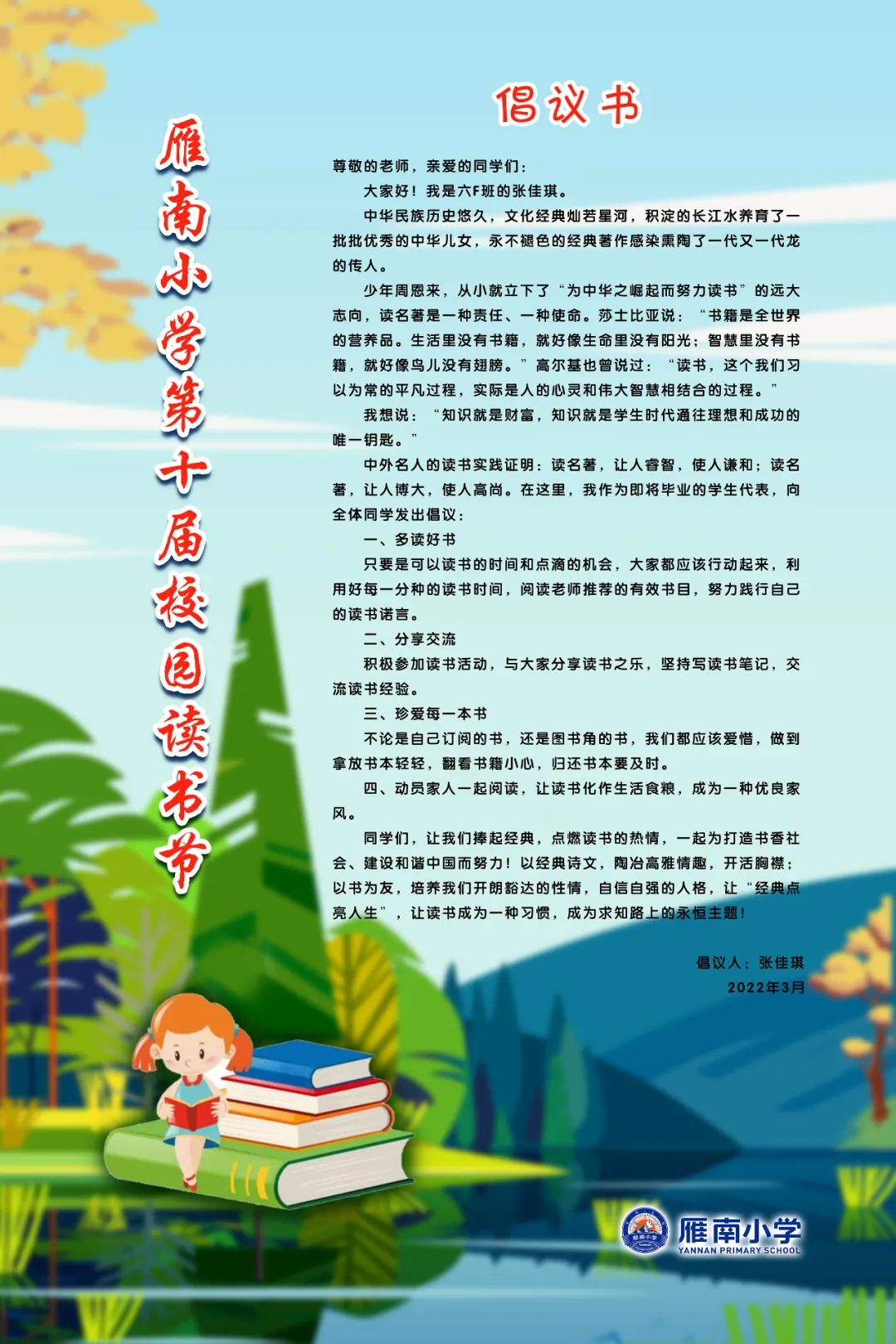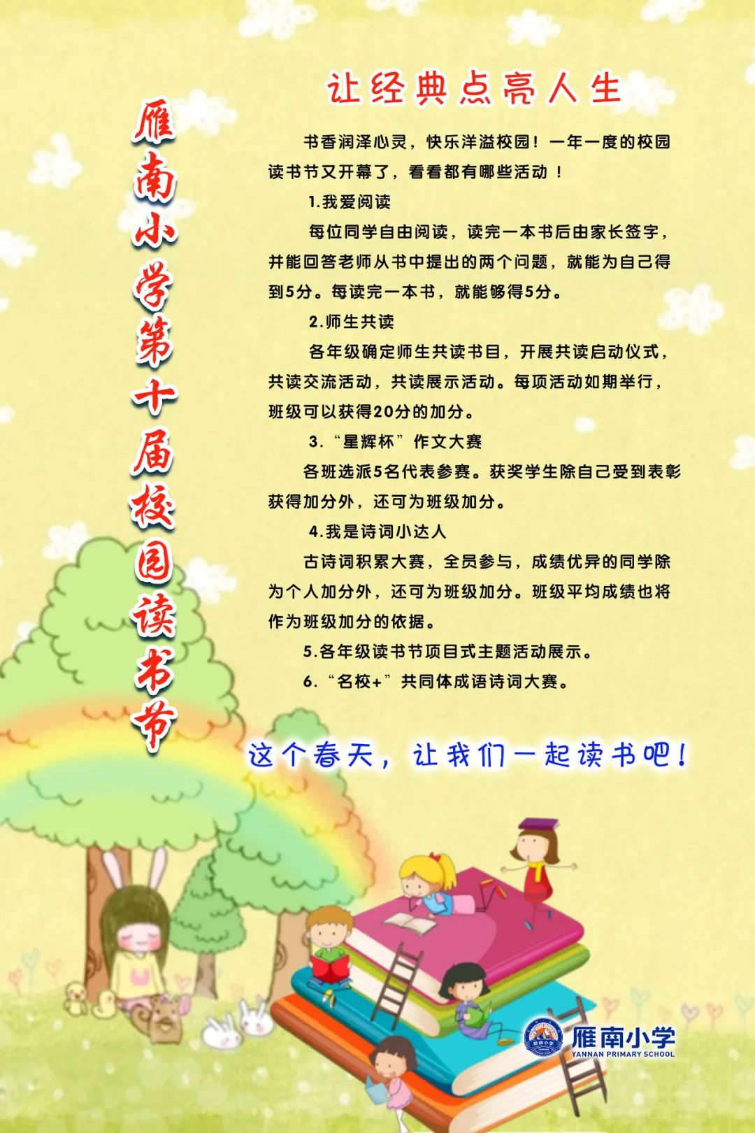 莺歌燕舞春光好,书香墨香满校园。在这个春意盎然的季节里,让我们与经典同行、与好书为伴,让书香润泽心灵,让经典点亮人生!相信雁南学子们必将插上阅读的翅膀,展翅高飞!