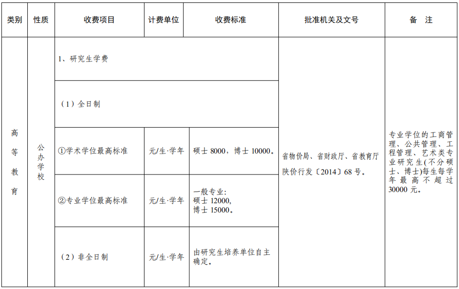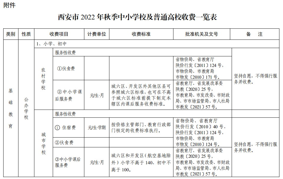 西安市2022年秋季 中小学校及普通高校收费一览表