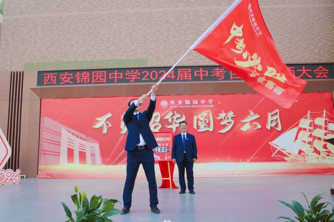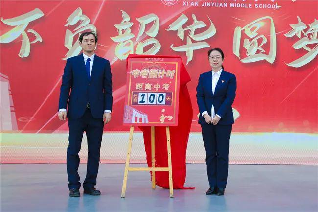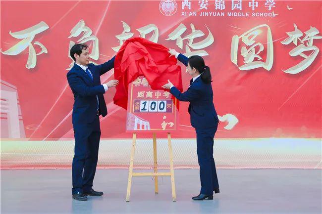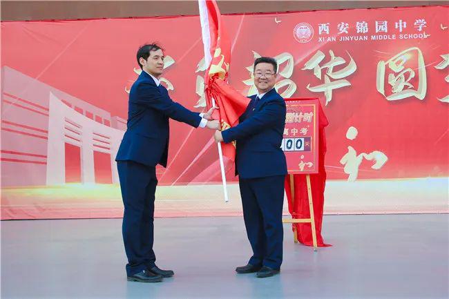 锦园中学副校长康艳丽为中考倒计时进行揭牌,倒计时上的100天,是奋斗的符号,是一种无声的勉励;樊校长给马老师授旗,这面象征胜利的旗帜,赋予同学们拼搏的力量与积极向上的信念。祝愿锦园学子们鲤跃龙门,载着梦想飞翔!