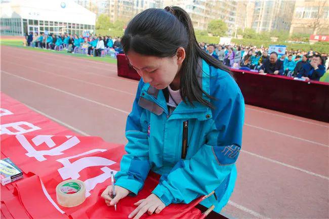 九年级全体学生在百日誓师条幅上郑重签名,一个名字,信守一纸承诺,担起一份责任;一笔坚定,书写一篇华章,撑起一个梦想。同学们写下自己心中勇敢前行的愿望,每一笔都代表着同学们奋战到底的决心和笑傲六月的信心。
