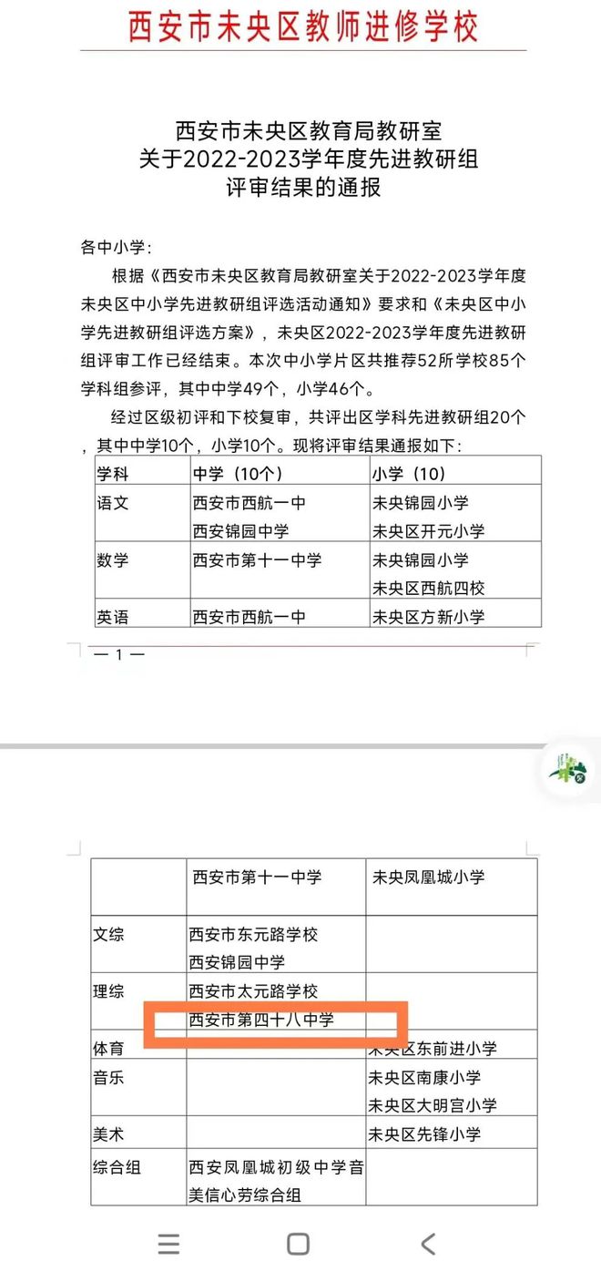 近日,西安市未央区教育局教研室公布了2022-2023学年度先进教研组的获奖名单。我校理化生教研组在全区49个中学教研组中脱颖而出,荣获未央区“优秀教研组”的称号。
