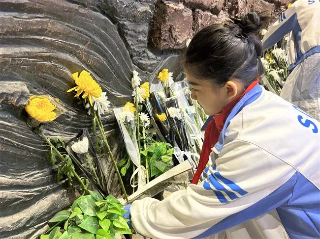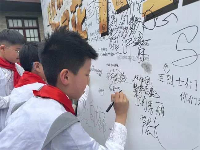 全体少先队员通过敬献鲜花、签名墙寄语、诗朗诵、讲解员老师讲述红色故事等方式,深切缅怀革命先烈,寄托无限哀思。
