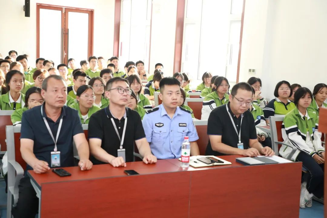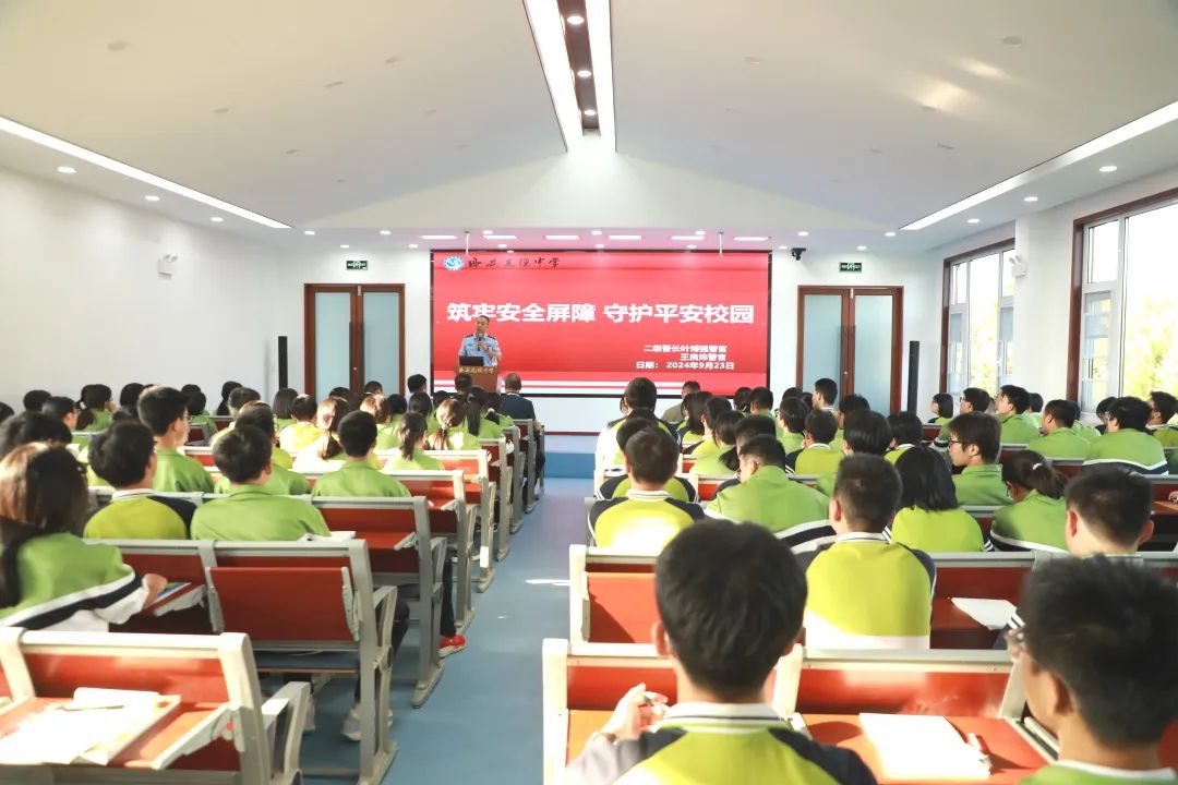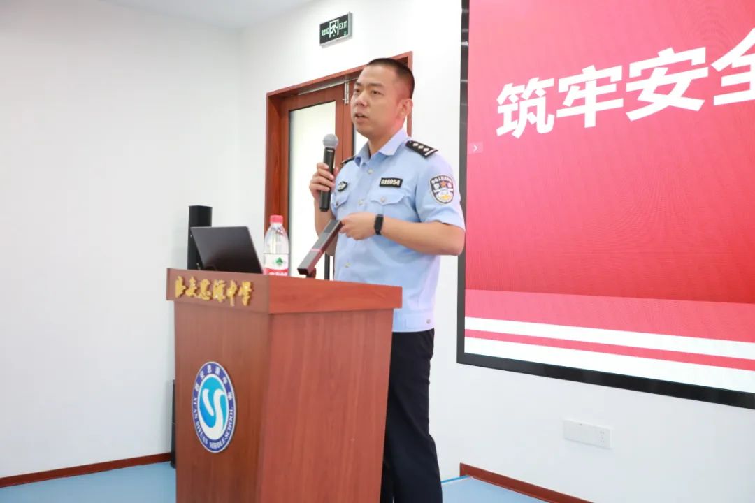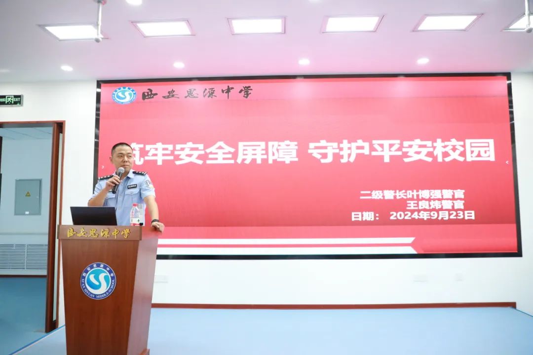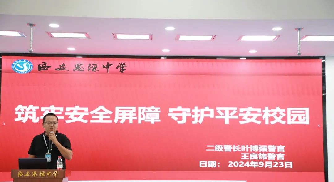 为进一步提高西安思源中学学生的安全防范意识,增强自我防护能力,全面普及校园安全常识,营造安全、文明、和谐的校园氛围。9月23日下午,西安思源中学特邀灞桥区公安局狄寨派出所二级警长叶博强警官、一级警员王良炜开展防欺凌、防暴力、防网络诈骗的校园安全专题教育讲座。出席本次讲座的有德育副校长王强、教务主任张皓、安保中心主任王耀辉及高一年级班主任,本次讲座由教务主任张皓主持。