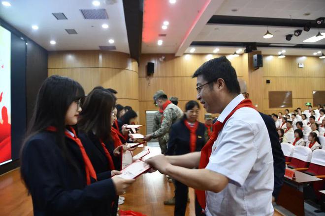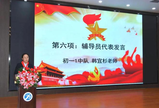 初一1中队韩宜杉老师鼓励大家,作为新时代的少先队员,同学们身上承载的不仅是红领巾的光荣与骄傲,更肩负着祖国未来的希望与重托。希望大家怀抱远大理想,做坚定信仰的追随者;锤炼品德修养,做红色基因的传承者。希望少先队员在红领巾的照耀下,成为那点燃希望与梦想的星火,在新时代的蓝天下,燃烧出属于自己的绚丽华章。