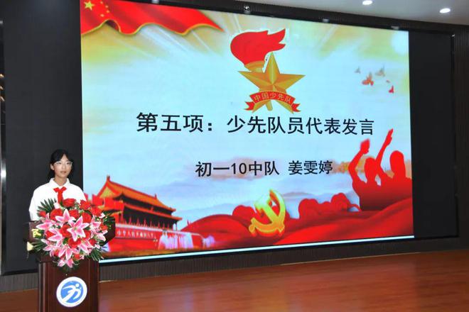初一10中队姜雯婷同学表示,每一位少先队员肩负着党的光荣使命,大家要珍惜这份荣誉,用实际行动来实现我们的誓言和承诺。希望大家像雄鹰一样,不惧风雨,勇往直前。