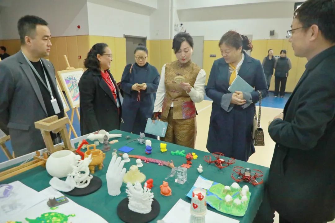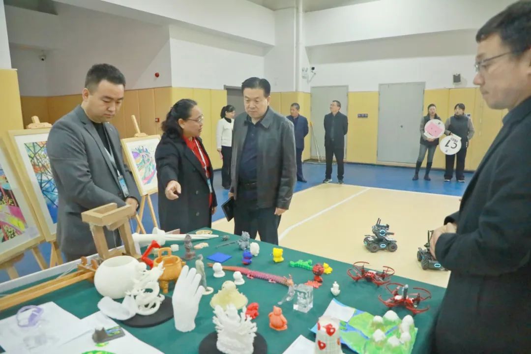 西安思源中学校长王琪、教学副校长孙化利、教师任毅为灞桥教育局领导讲解学校科学实验成果,灞桥区教育局领导对学校科学实验展示表示肯定。