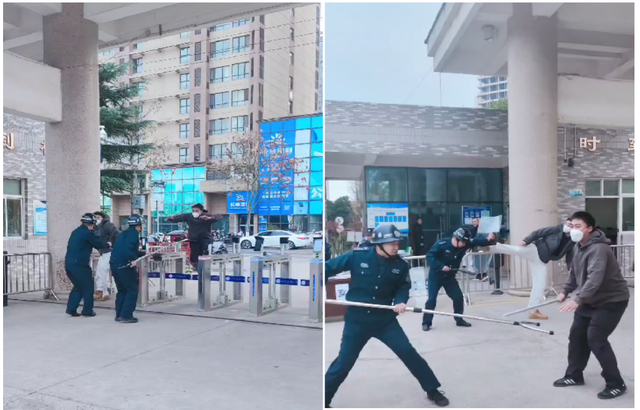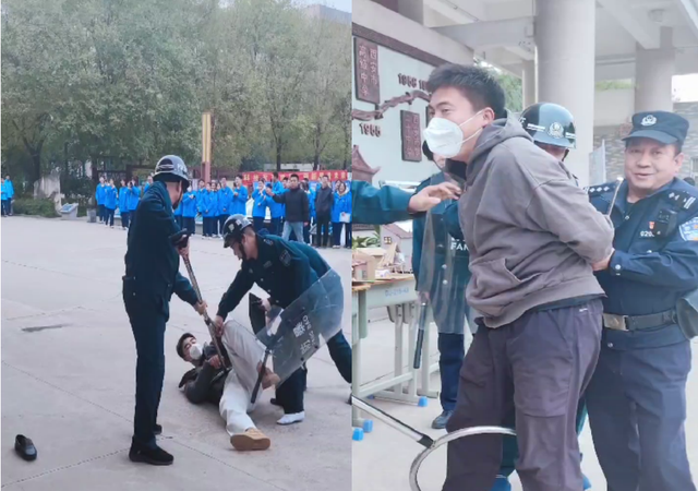随后开始防暴反恐实战演练。本次演练采取现场模拟突发事件的形式,由老师扮演的两名“歹徒”试图闯入校园伤害师生。面对紧急情况,门卫值守安保人员立即反应,第一时间启动一键报警器,拨打学校突发事件应急小组电话,同时与“歹徒”搏斗。学校接到通知后,立即启动《西安高级中学反恐防暴应急预案》,并用校内广播通知正在上课的老师立即紧锁教室门窗,防止犯罪分子进入教室。派出所民警接到报警后,第一时间组织警力赶到现场进行处置,带领校园安保人员及时控制“歹徒”,成功处置突发事件。