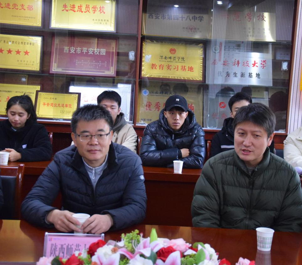 陕西师范大学体育学院党委副书记王一喆、副院长高元元、2021级辅导员汤治国、实习带队教师谢茜等一行领导莅临西安市第四十八中学,学校党支部书记兼校长孟小军、党支部副书记曹宽利、副校长高峰、副校长米彦武、艺体中心主任杨全红、安保副主任杨飞、体育教师毕娟茹出席了会议。会议由艺体中心主任杨全红主持。