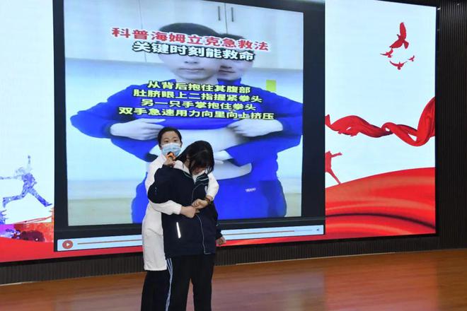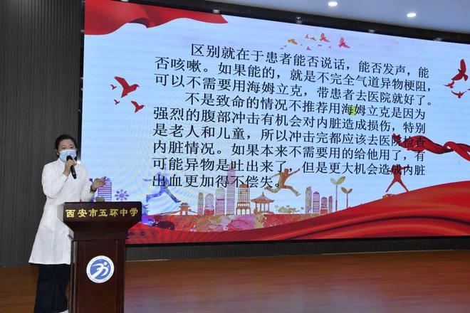 校医李娟老师现场向五环中学志愿者培训《气管异物怎么办?—海姆立克急救法》。