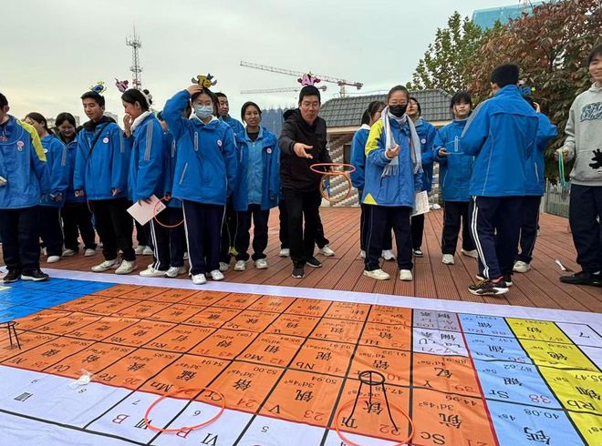 “套元素赢大奖”是将一副巨型元素周期表平铺在地上,在知识点位置设置铁架台;学生先进行套圈,套中后需回答套圈所对应元素的相关问题,回答正确就可以现场领取精美礼品一份。同学们跃跃欲试,乐此不疲,复习了相关化学知识的同时也体验到了化学之趣。