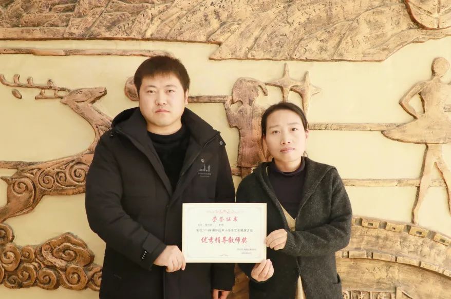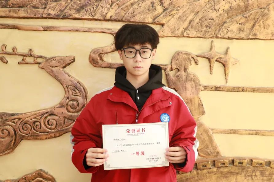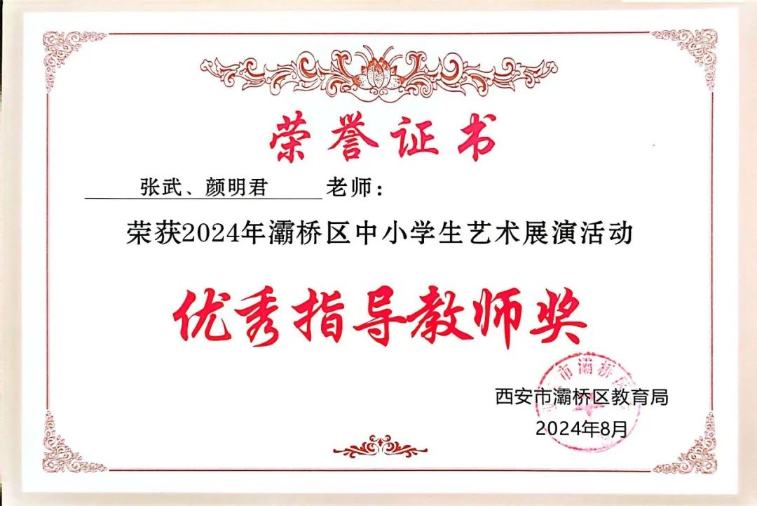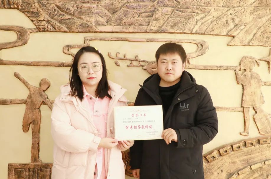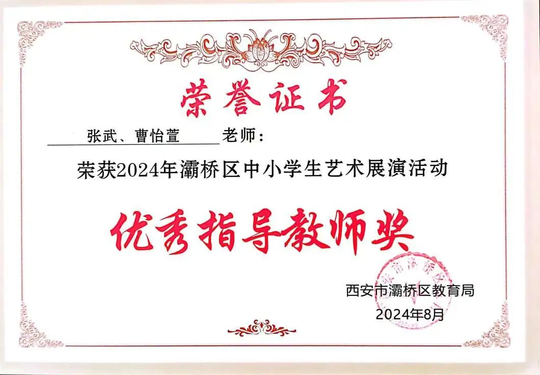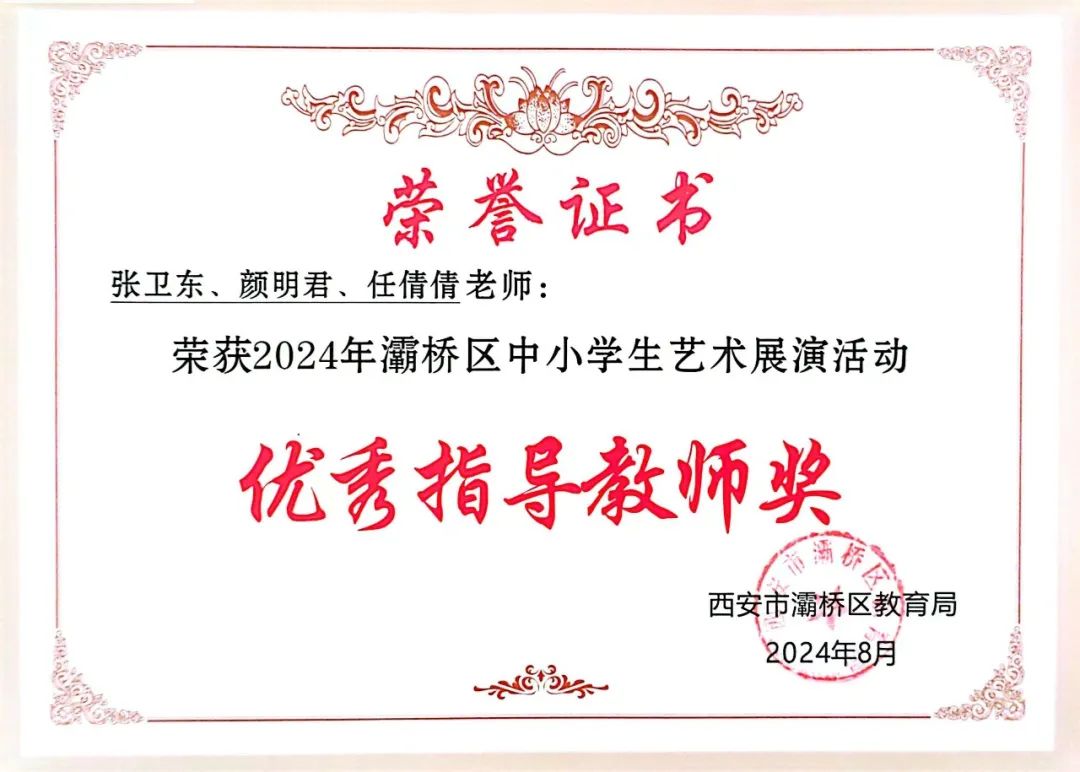 校长助理高建伟、德育副主任李刚为2024年灞桥区中小学生艺术展演活动中获奖师生颁奖。