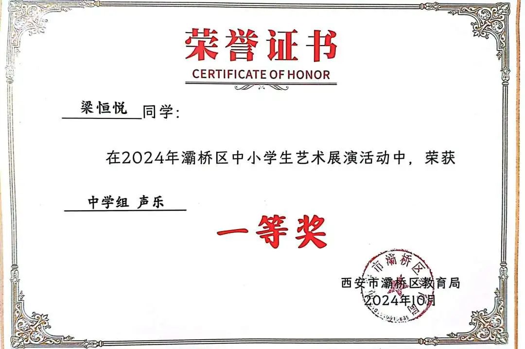 梁恒悦荣获中学组声乐一等奖
