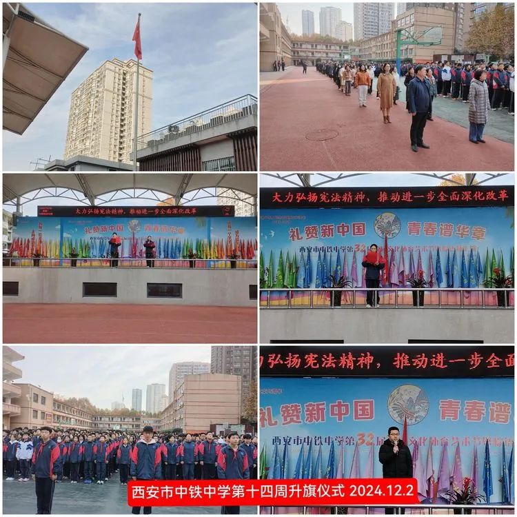 在周一升旗仪式上,学校组织高二6班张国轩同学带领全校师生诵读宪法条款,初一3班郭可馨同学进行《弘扬宪法精神,守护美好未来》主题演讲,号召中铁学子牢记宪法使命,共沐法治之光,用宪法和法律守护美好未来。