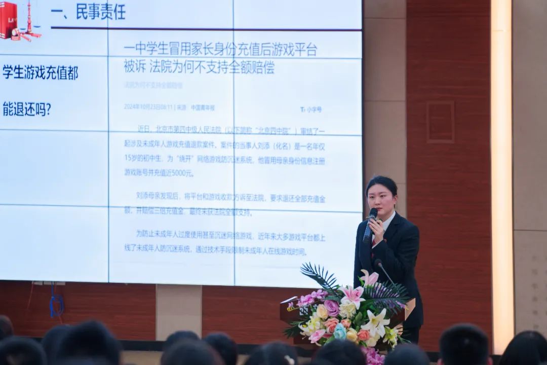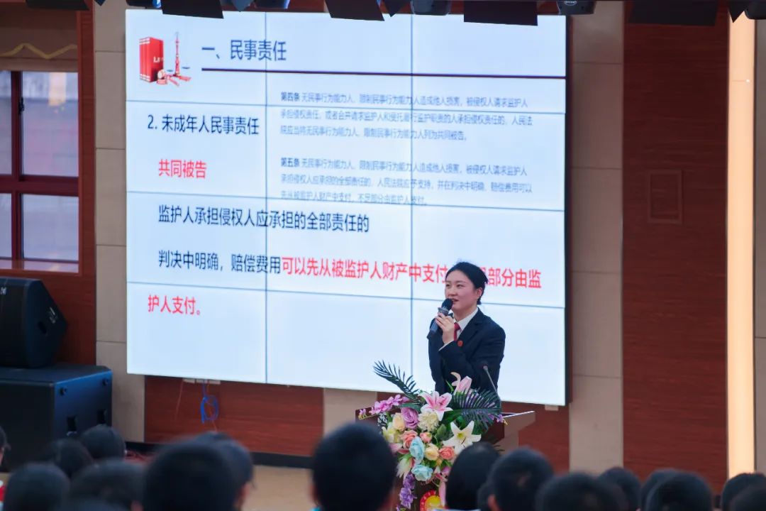 她从“民事责任、行政责任、刑事责任”三个方面进行讲解,让学生明确自己的权利和义务,能运用法律知识解决问题,保护好自己、约束好自己,成为守法护法的践行者和宣传者。