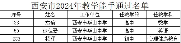 笃行不辍,必有所获。近日,西安市教育局公布了2024年西安市基础教育教学能手评选结果,西安市华山中学袁菊、徐佳豪、杨晖三位老师喜获殊荣,被授予“西安市基础教育教学能手”称号。