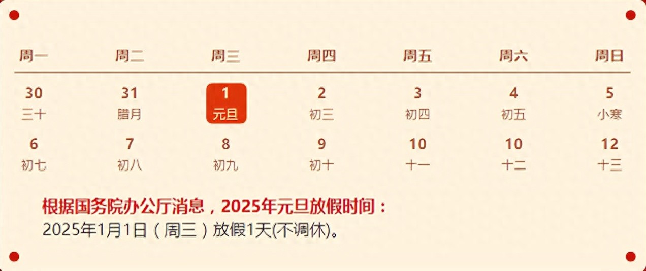 放假时间:2025年1月1日。上课时间:2025年1月2日(按周四课表上课)。