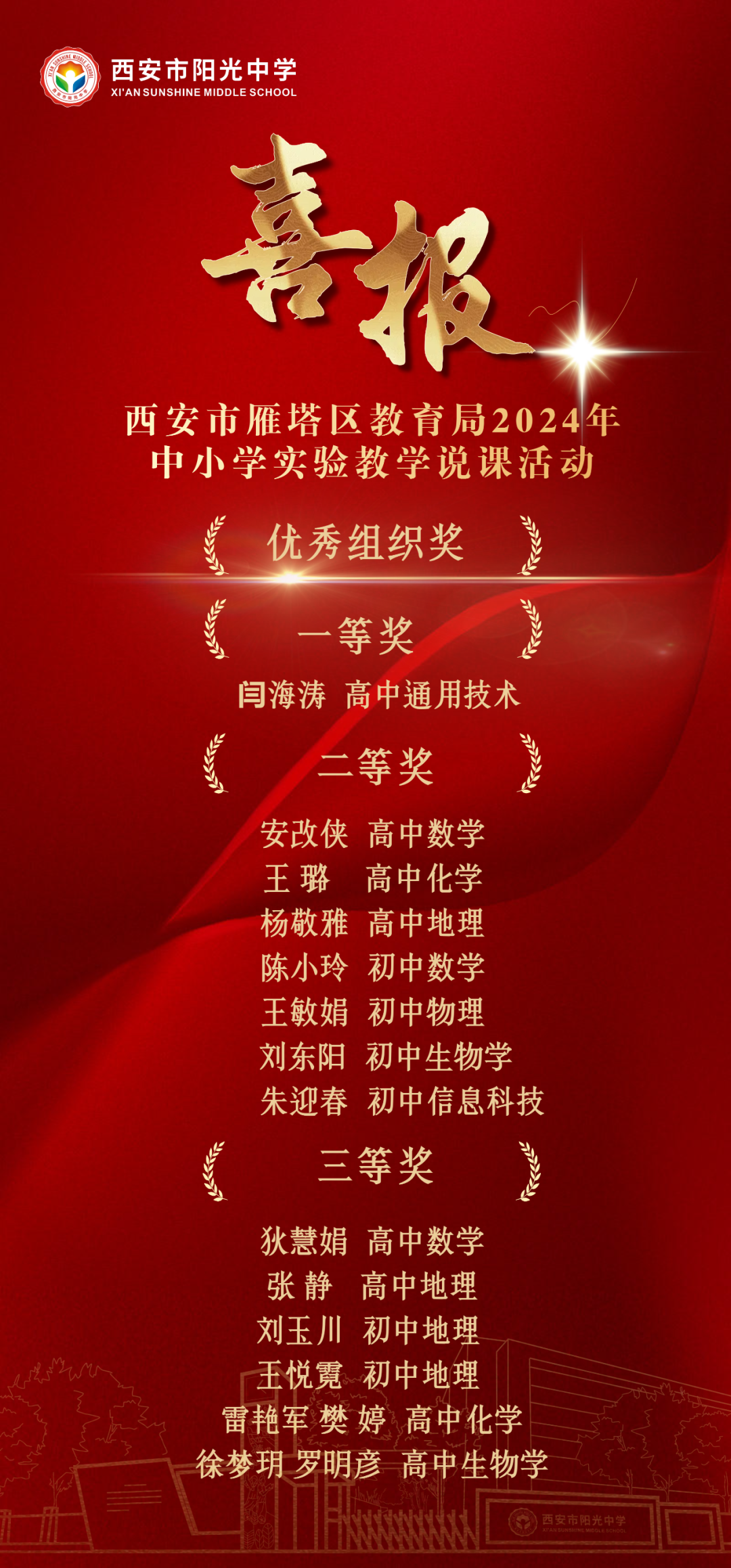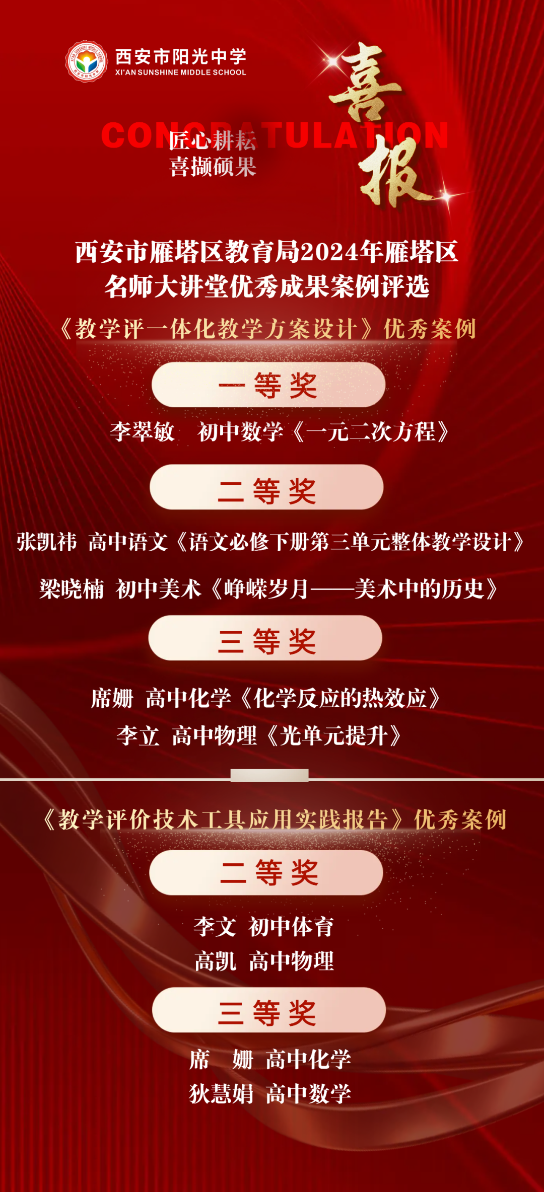 冬日送暖,喜讯频传!近日,雁塔区教育局“2024年中小学实验教学说课活动”和“2024年名师大讲堂优秀成果案例评选”结果揭晓,西安市阳光中学多名教师斩获佳绩!