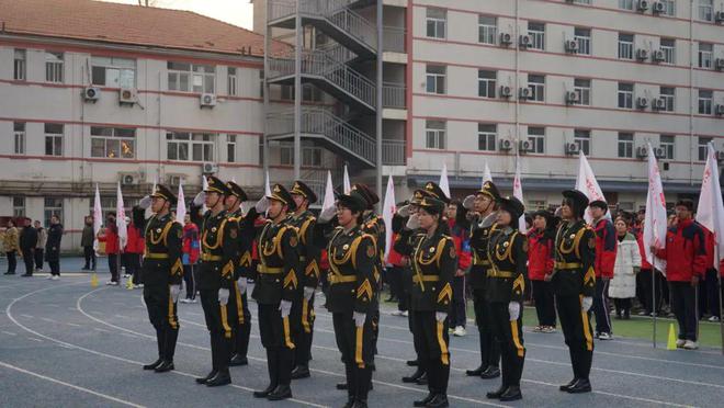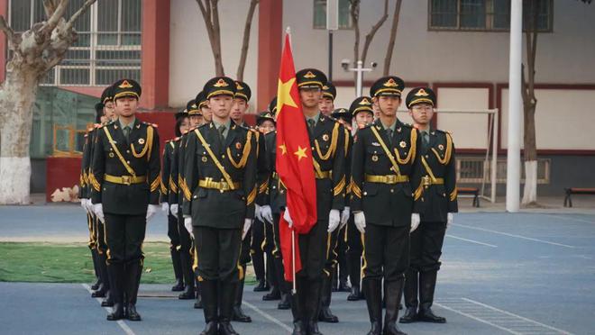 开学典礼在庄严的升旗仪式中拉开帷幕。由校国旗护卫队组成的护旗方阵踏着铿锵节奏,以整齐的步幅行进,橄榄绿制服在晨光中勾勒出青春最美的轮廓,鲜艳的五星红旗在激昂的国歌声中冉冉升起。全体师生庄严肃立,少先队员行队礼,其他师生行注目礼,爱国之情在每个人心中激荡,为新学期注入奋进的力量。