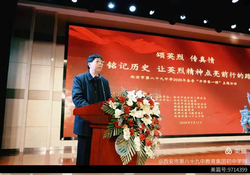 为纪念世界反法西斯战争80 周年,引导学生铭记历史、缅怀先烈,传承红色基因,坚定理想信念,厚植爱国情怀,由西安市退役军人事务局主办,西安市英烈故事 “五进” 宣讲团精心策划的 “颂英烈・传真情 —— 铭记历史,让英烈精神点亮前行的路” 主题活动,于2月17日走进西安市第八十九中学,为师生们带来了一场意义非凡的 “开学第一课”。