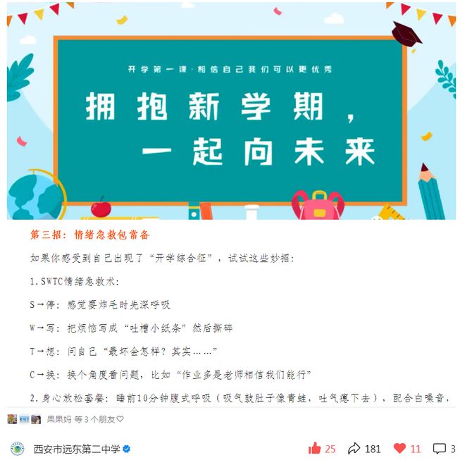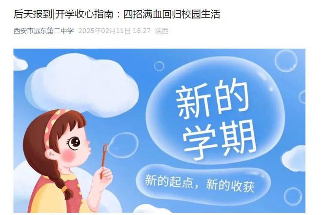 就在同一天,学校公众号像一位贴心的朋友,悄悄给同学们送上了新学期《开学收心指南—四招满血回归校园生活》。这份指南从体育锻炼、心态调整、情绪调节、计划制定四个方面,为同学们送上了“收心秘籍”,希望大家都能精神满满地开启新学期的校园之旅。