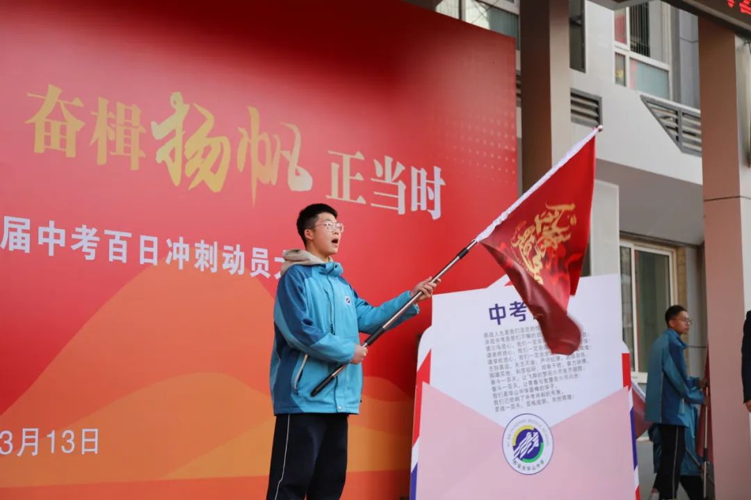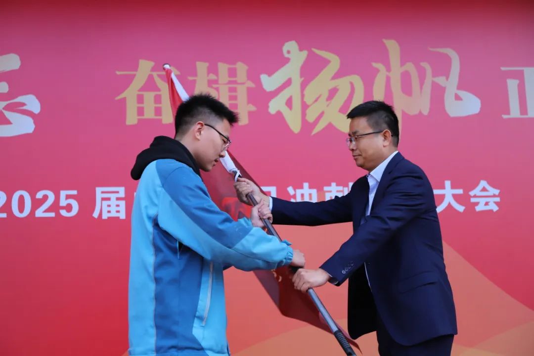 我校教学副校长贺峰为初三年级10个班授旗,并发出中考冲刺动员令。旗帜飘扬,象征着团结与力量;号角嘹亮,代表着冲刺与胜利。授旗仪式不仅是对过去的总结,更是对未来的展望。这一刻,每位同学仿佛浑身充满力量,准备迎接最后的挑战。