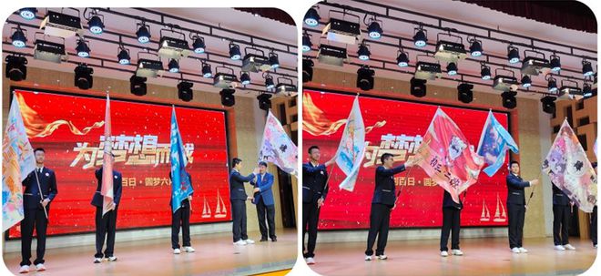 辛校长为各班授班旗,各班班长接过班旗,面向台下挥舞,全体学子大喊加油。