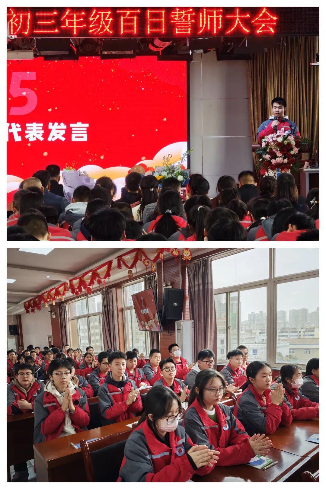 学生代表谭凯文上台发言,他分享了自己的学习心得和体会,鼓励同学们珍惜时光,努力拼搏,共同迎接中考的挑战。