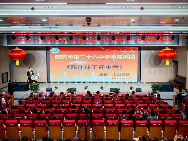 为深入贯彻落实教育部《家校社协同育人"教联体"工作方案》,进一步加强家校合作,助力学生顺利应对中考,3月14日,二十六中教育集团在太乙分校成功举办了“家校携手育英才 助力中考赢未来”大型家庭教育报告会。本次活动特邀明人家庭教育创始人、中国家庭教育学会专家会员、家校共育学术支持专家、中国关心下一代工作委员会事业联盟专家——大山笑长,为全体初中毕业生家长带来了题为《如何陪伴孩子迎中考》的精彩讲座。全体初三家长齐聚一堂,聆听专家智慧,解锁科学陪伴之道,为孩子的中考征程注入温暖力量。