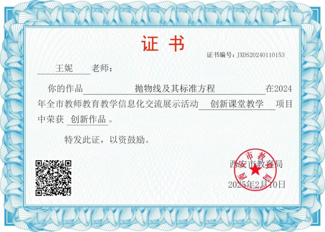 王妮老师的作品《抛物线及其标准方程》获得创新课堂教学项目创新作品奖。