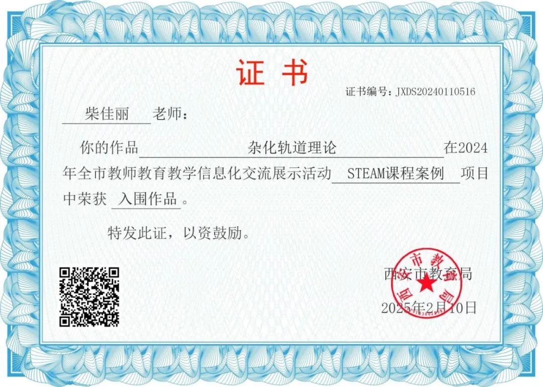 柴佳丽老师的作品《杂化轨道理论》获得STEAM课程案例项目入围作品奖。