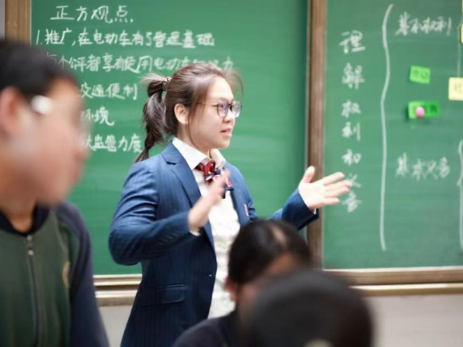 道德与法治刘娜老师关于八年级下册第二单元权利和义务的复习课,以辩论赛的形式,让学生就“共享电动车是否要在生活中普及使用”展开激烈的讨论,不仅激发了学生们主人翁的意识,也让学生们结合法律规定的公民权利和义务的知识角度,从社会发展方面去深度思考,并借助AI技术寻找更多观点的支撑。各方观点不仅多角度,多方面而且紧扣主题,整个课堂活跃精彩。