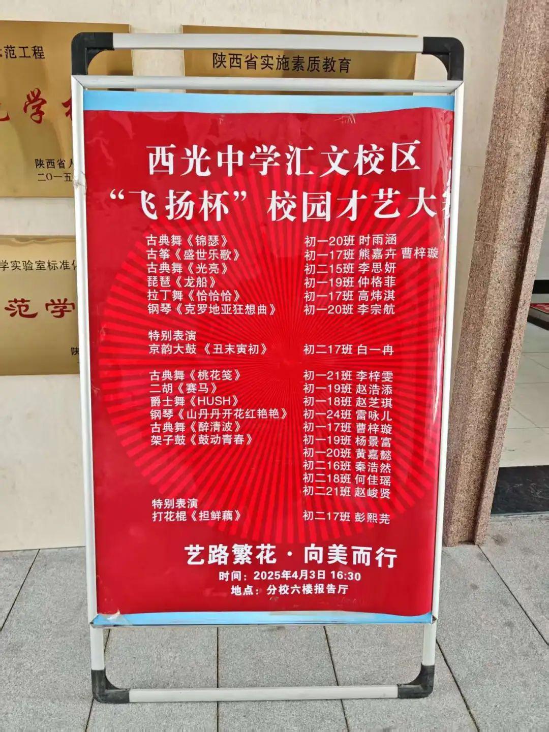 2025年4月3日,在这春风送暖、万物生长的人间四月天,西光中学教育集团汇文校区成功举办了“艺路繁花・向美而行”首届“飞扬杯”校园才艺大赛。此次大赛不仅为同学们提供了展现艺术才华的舞台,更是一次学校艺术教育成果的集中呈现,在丰富校园文化生活的同时,有力地推动了学校艺术教育的全面发展。