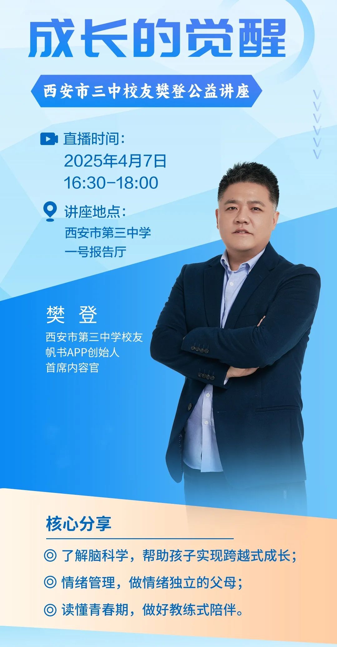 樊登是西安市第三中学高93届毕业生,西安交通大学工学学士、管理学硕士,北京师范大学博士;曾获国际大专辩论会冠军、担任央视《三星智力快车》等节目主持人。2013年他创办“樊登读书”,2023年更名为“帆书”,注册用户已超7000万人;作为新阅读开创者,以“持续传递好书价值”为愿景,帮助3亿书友因阅读受益。同时,他始终深耕家庭教育领域,并出版多篇专著。