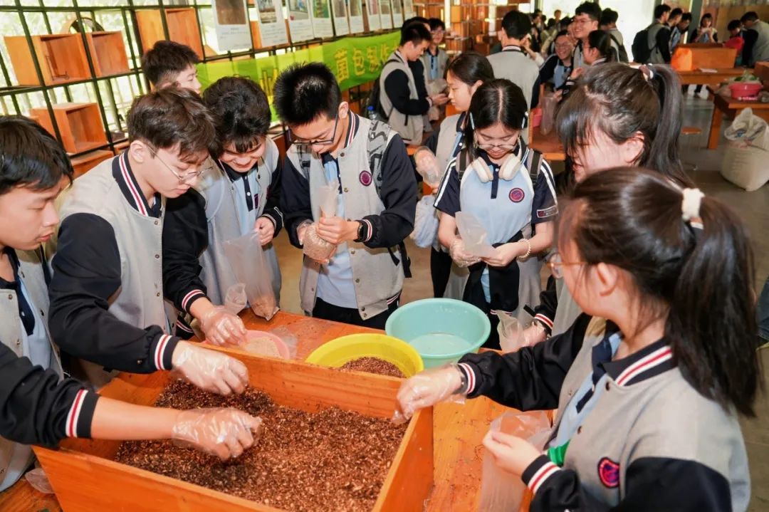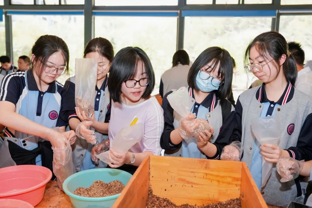山间腐木蕴神奇,菌种轻藏待时机。菌包虽小乾坤大,孕育生机暗萌滋。同学们亲手参与木耳菌包制作,菌包原材料配比,木耳生长所需的碳源、氮源、酸碱平衡,装袋、灭菌接种、菌丝繁殖原理等过程,一份精心,一份执着,一双小手,一个未来。