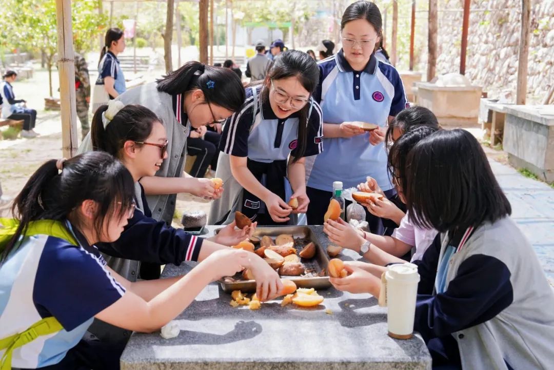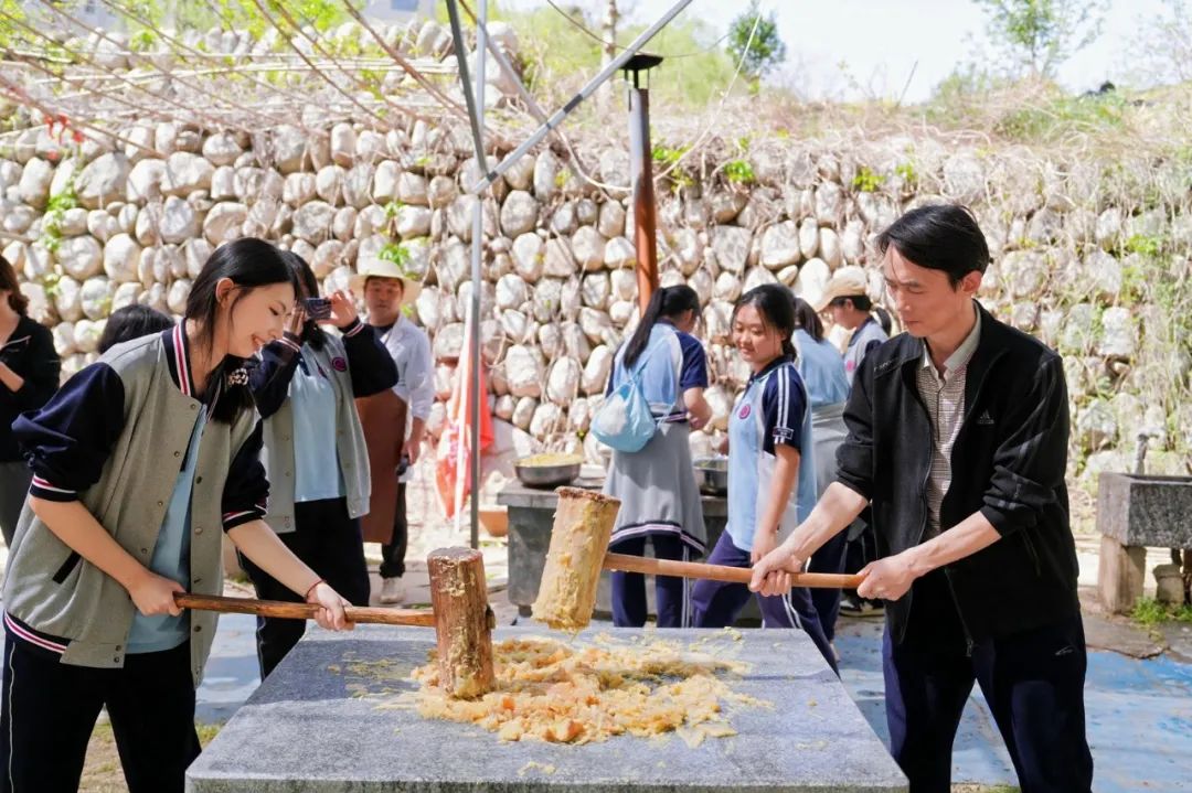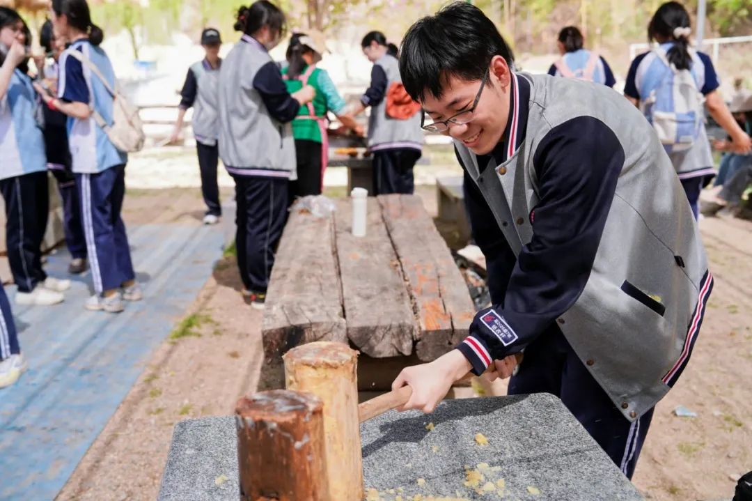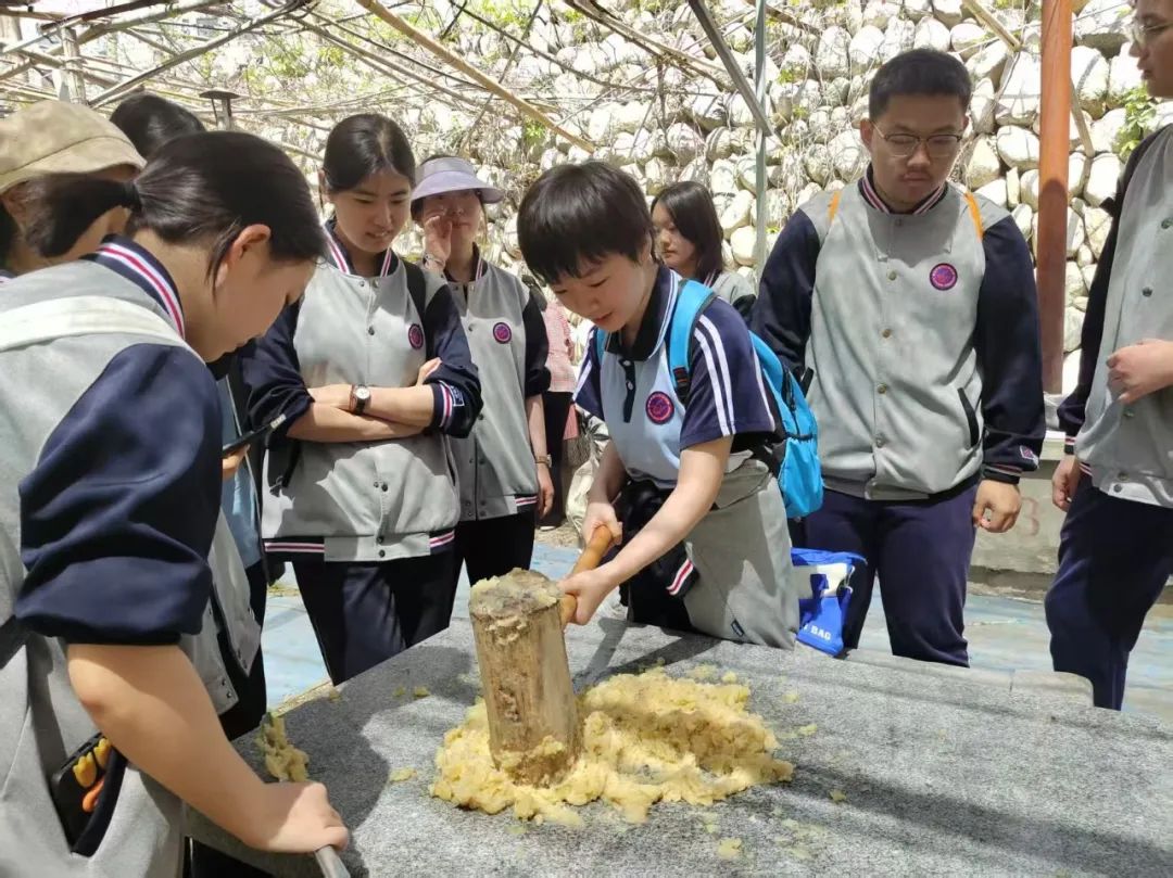 可以亲手参与一道乡间美食——洋芋糍粑的制作过程,同学们别提有多激动了,个个脸上洋溢着欢乐的表情。剥皮、碾碎、捶打、分工、协作,一碗碗软糯如云朵,细腻似丝锻的洋芋糍粑就做成了,质朴的味道,浓浓的烟火气,同学们亲身体会参与的乐趣,细品劳动成果的每一口香甜。