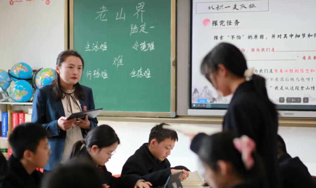 以经典课文《老山界》为载体,通过“初读感知—精读批注—联读观今”三阶递进式教学,带学生重走红军翻越老山界的艰险之路,引领学生深入体会革命精神。教学过程融合文本细读与思辨实践,通过小组合作探究、分享展示,引导学生在鉴赏文学作品的同时感悟革命精神,实现革命传统教育与语文核心素养的双重提升。课堂上陈老师借助AI还原老山界立体地形图,学生通过平板标注行军路线,结合文本细节分析革命精神内涵。课堂实现师生互动、生生互动。
