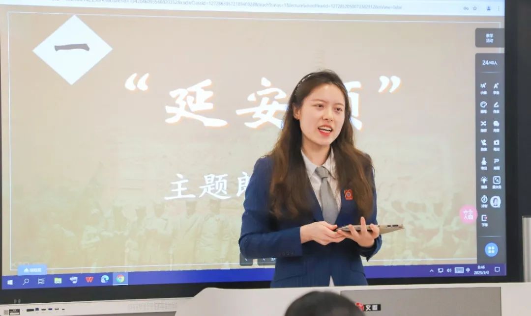 中国教育三十人论坛、上海浦东教育发展研究院联合西安市教科院、雁塔区教育局等16位教育专家齐聚西安藤信学校,参与了乔喻老师的示范课《回延安》。课堂中,学生自主完成了一场包括主持、表演、点评在内的完整的朗诵大赛。学生通过课前小组协作+AI辅助的方式完成脚本创作、角色分工与舞台设计,并完成现场投票、点评及课堂总结。