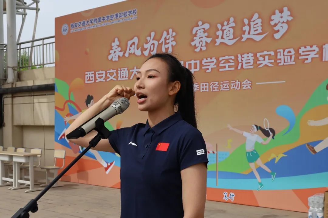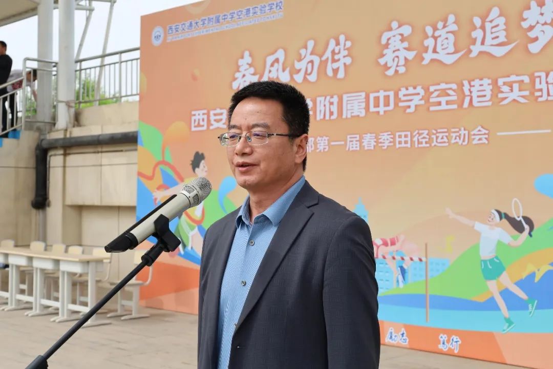 张博宣布“春风为伴 赛道追梦”西安交通大学附属中学空港实验学校小学部首届春季田径运动会开幕。