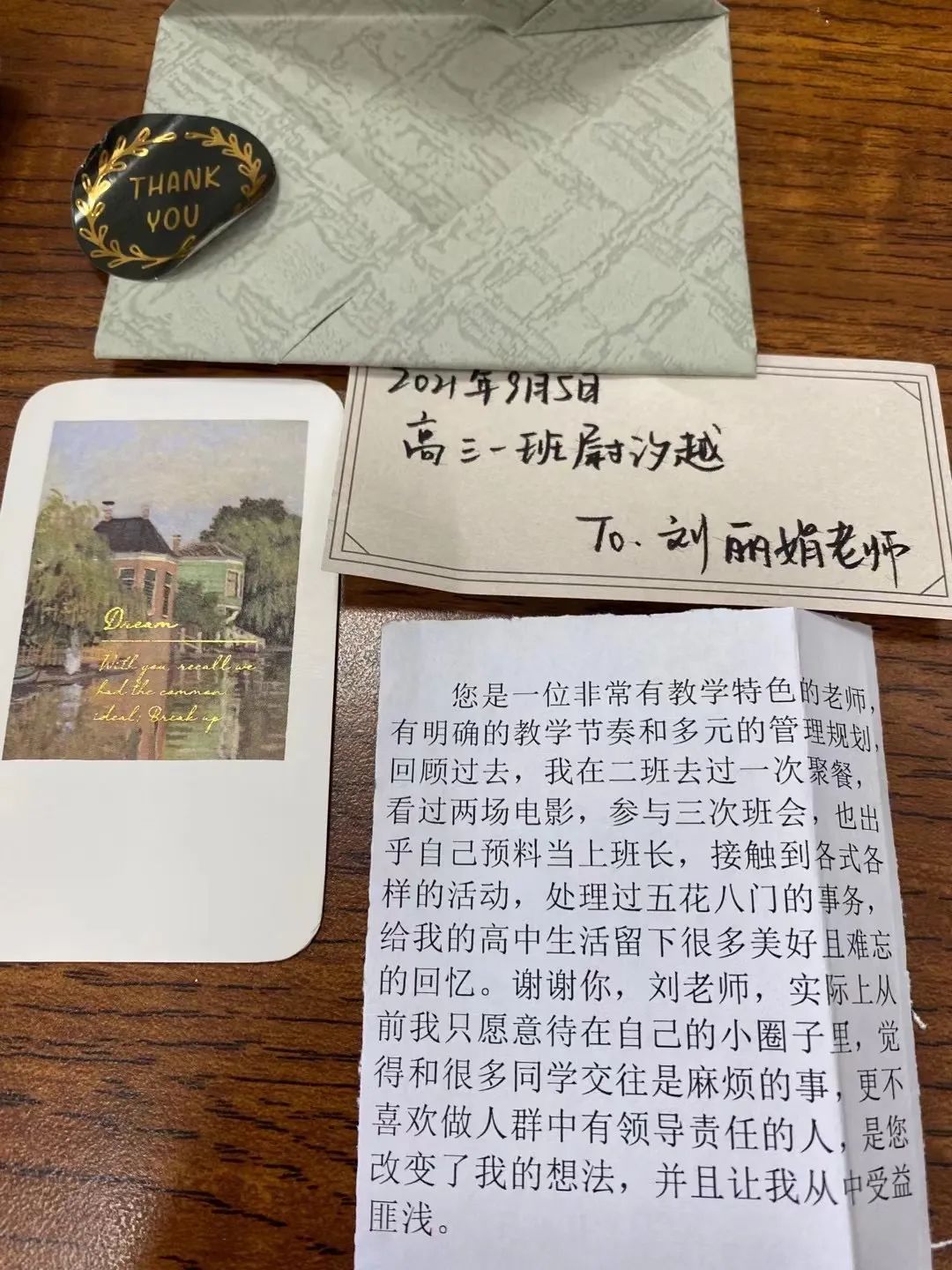 在如今老师和学生关系日益疏远的趋势下,刘老师仍然坚持着既要教导学生知识,又要关注学生心理和性格养成的教学原则。高中的前两年里,她带领全班同学组织了四次主题班会。对我来说,这四次班会很大程度上改变、完善了我的性格和行为方式,从第一次上台表演的胆怯腿软,到经验积累后的流利顺畅,自夸一点讲,在这位阅历丰厚的老师手中,我从朴实无华的石坯,被打磨成光彩四溢的宝石。