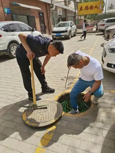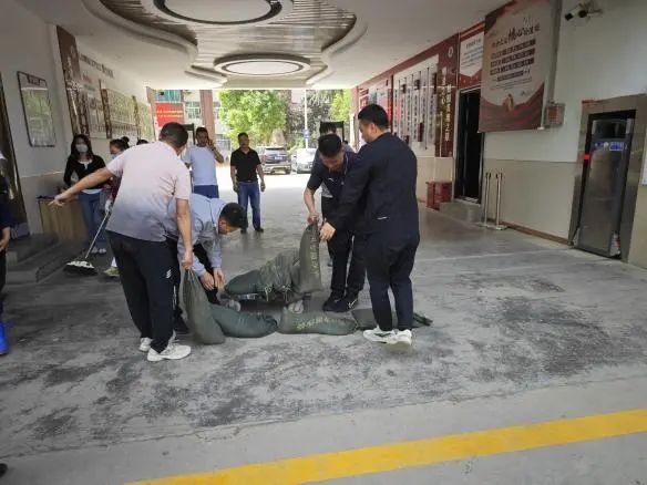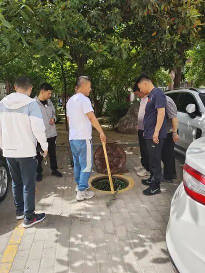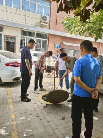 按照预案,各小组迅速行动,分赴指定区域开展防涝作业。在校门口等地势低洼的通道入口,物业人员迅速堆放沙袋,以防洪水倒灌;后勤管理部门则开启排水井井盖,帮助排除内涝,并检查防坠网,确保安全隐患得以排除;同时,专业人员还对下水道进行了检查与疏通,确保排水系统正常运行。
