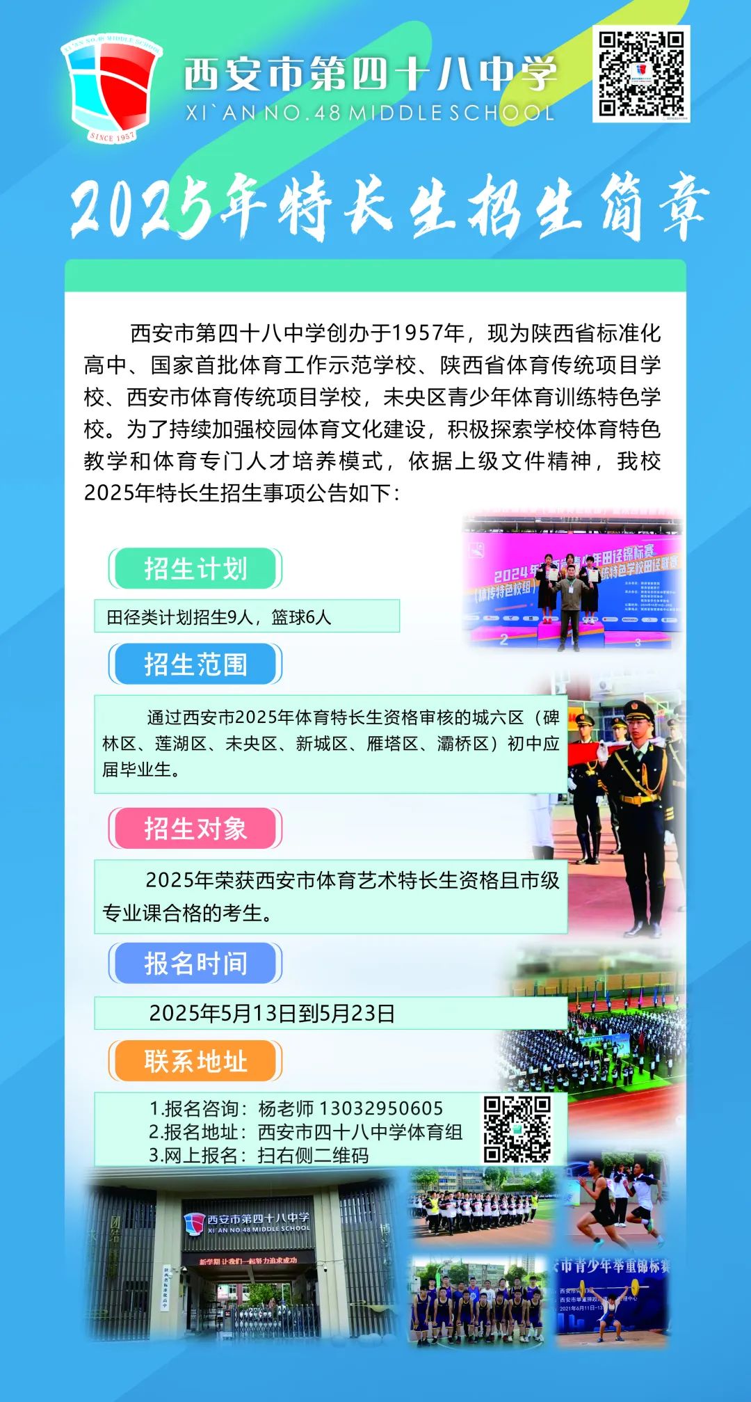 根据西安市教育局《关于印发2025年西安市普通高中招收体育艺术特长生工作方案的通知》精神,现将西安市第四十八中学高2025级拟招收足球、篮球、田径特长生有关事项公告如下: