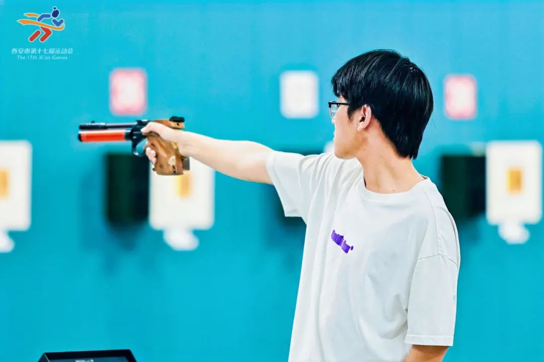 张展雄同学获得男子10米气手枪(甲组)个人第一名;黄桢煊获得个人第四名