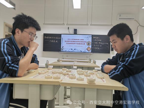 中国象棋赛场宛如没有硝烟的战场,选手们相对而坐,眼神中透露出专注与坚毅。红黑棋子在棋盘上纵横交错,每一步落子都蕴含着深思熟虑的策略。高年级的学长们棋风沉稳老练,擅长布局谋篇,以静制动;低年级的学弟学妹们则初生牛犊不怕虎,进攻凌厉,常常出其不意地发起攻势。