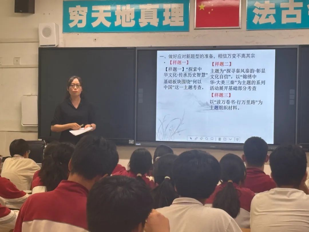 语文学科杨敏老师首先用生动的语言带领学生们走进中考作文版块,分享了中考学生作文中的亮点,继而有梯度地对学生进行作文建议指导,拓宽了写作思路,挖掘了主题深度。随后,杨老师又列举了几个经典作文题目,让学生丰富创作素材,拓宽选材范围。建议同学们聚焦陕西本土文化(如秦岭生态、科技前沿、时代精神等角度,丰富个性化素材库。