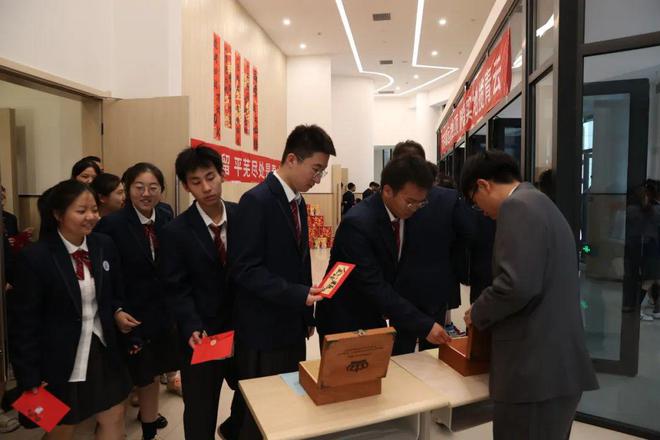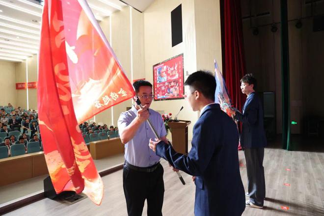 授旗环节庄严而振奋人心。张博代表学校为高2026届各班级授旗,各班级学生代表接过这面“战旗”,预示着新征程的开启。