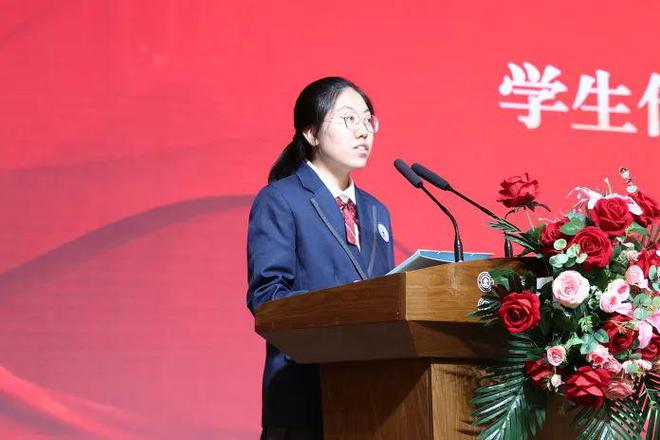 赵一诺同学作为学生代表发言,她与同学们分享了四点制胜法宝,一是心态为帆,保持自信稳定;二是目标为灯,设定清晰方向;三是方法为桨,讲求科学高效,课堂为主,拒绝拖延;四是健康为锚,规律作息,劳逸结合。并希望与大家一起全力以赴,用汗水浇灌明年盛夏的梦想花开,不负韶华,不负青春。