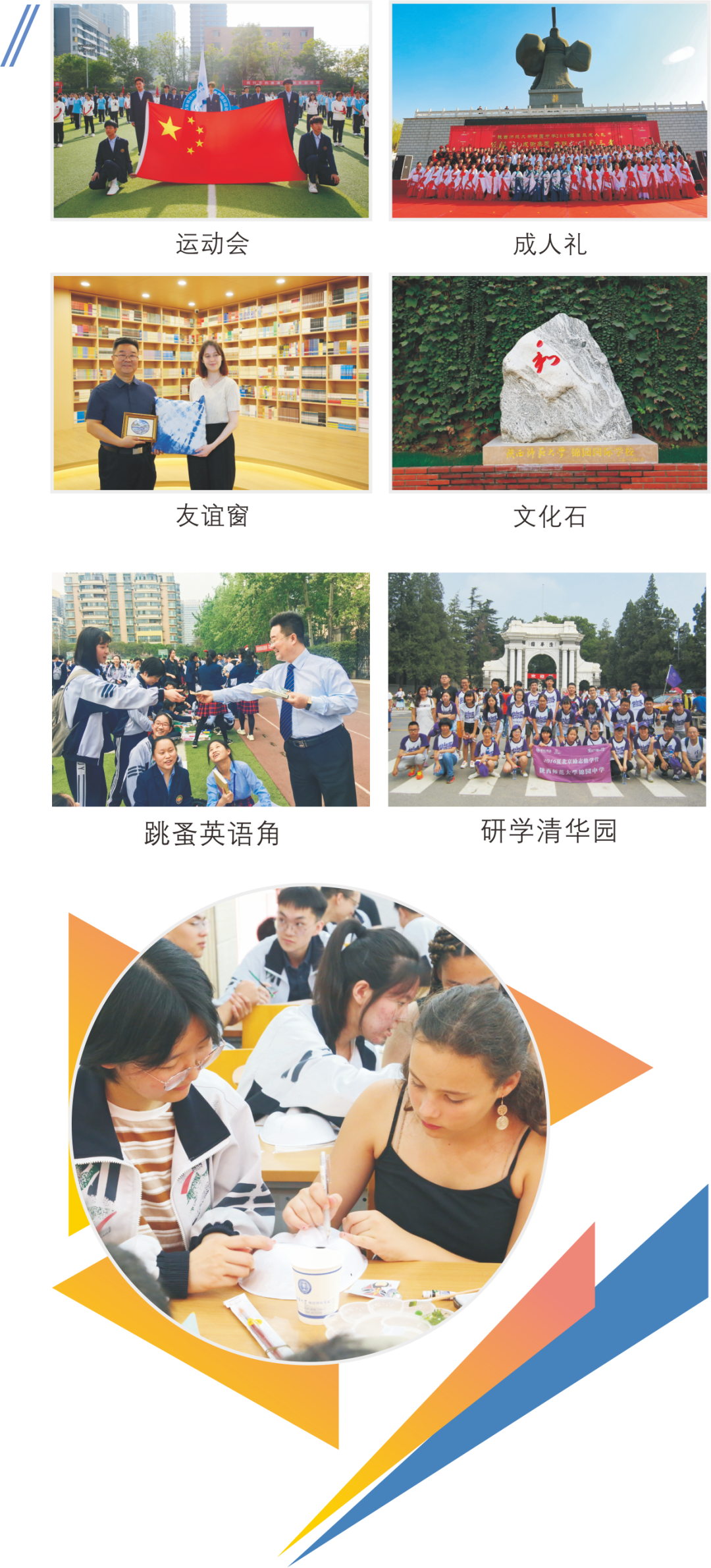 西安锦园中学以全面发展为导向,通过多元的艺术体育教育实践,通过“五节四月五礼”活动,为学生搭建起展现自我、追逐梦想的广阔舞台,实现了学生综合素质提升与校园文化建设的协同发展。学校有30多个特色社团,如日语、俄语、科学实验、创客、舞蹈、啦啦操、篮球、排球、棒垒球、朗诵、话剧、管乐、合唱、版画、泥塑、剪纸等。我们倾力为每一位锦园学子提供多元化、层次化、特色化的教育环境。
